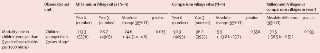 Enter the Lancet, a reputable medical journal which has a worrying tendency to publish really disreputable social science research, which just published a study by Sachs et al. showing that, over three years, child mortality (under the age of five) has fallen by roughly 25% across nine Millennium Villages. When compared with `control' villages (which were chosen later and differ from the MVs in many, substantial ways), the drop was even larger - close to 31%.