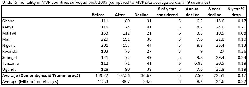 I agree with your analysis. One question, though, as you point to national averages and the overall progress in SSA. Sachs et al do say that "the pace of mortality reduction in Millennium Village sites was three-times greater than the most recent 10-year national rural trends", and provide a table to go with this claim in the appendix, page 9.