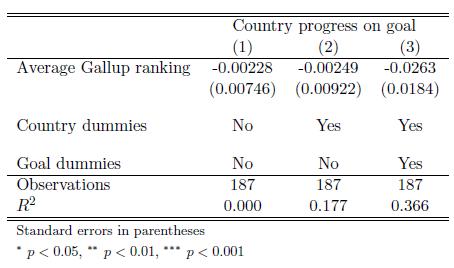 Sadly, this isn't the case: comparing data from the Center for Global Development on country-level progress on individual goals to the country-level rankings from Gallup shows no absolutely no connection (positive or negative) between country-level preferences (how high the respondents ranked an MDG goal) and outcomes:
